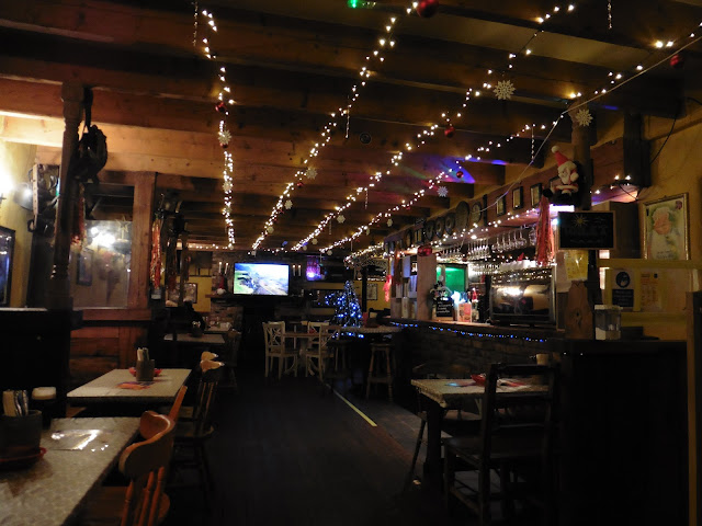 Then soup, followed by sausages and chips for Ann and seafood tagliatelle for me. All very nice and reasonably priced.